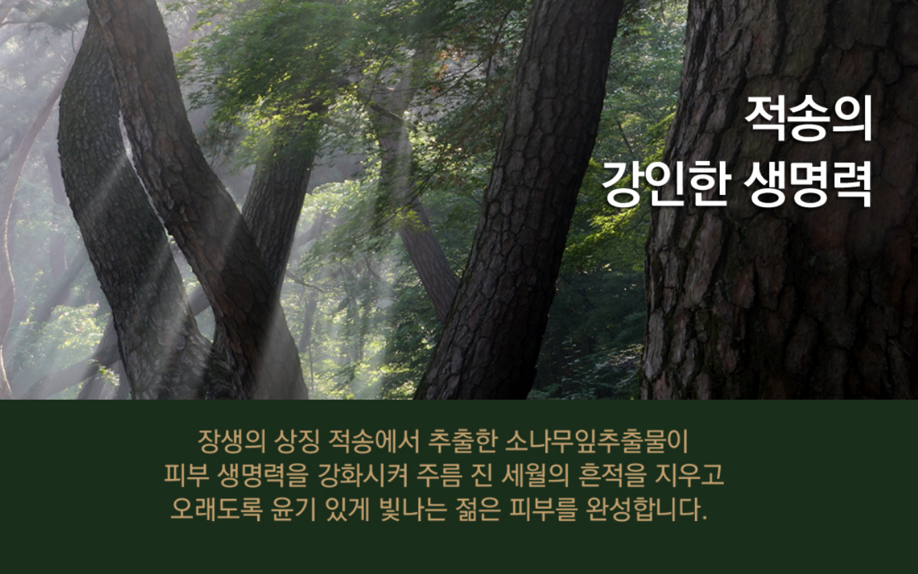 또한 적송은 장생의 상징으로 소나무잎추출물이 피부 생명력을 강화시켜 주름 진 세월의 흔적을 지우고 오래도록 윤기 있게 빛나는 젊은 피부를 완성합니다.