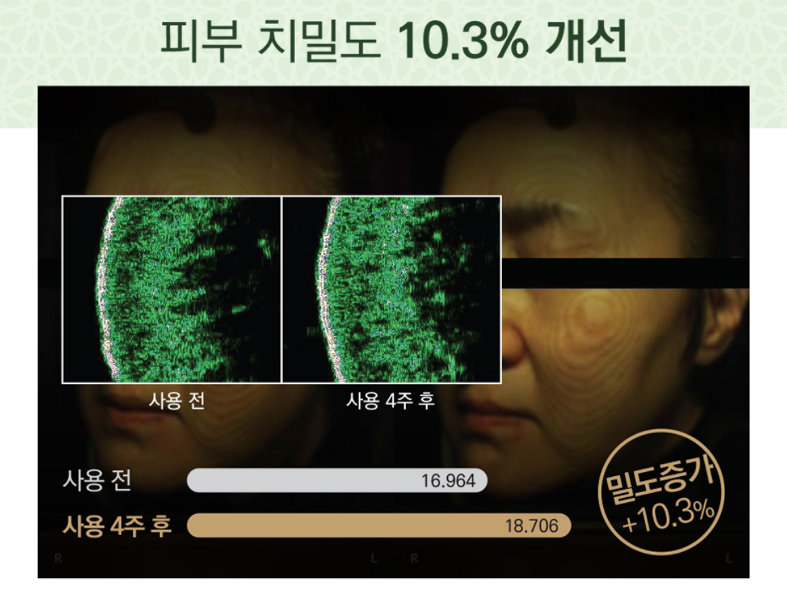 피부 치밀도가 사용 전보다 10.3% 개선된 결과를 보여주었습니다. 또한 눈가 주름 6.4 % 개선, 안면리프팅 3.4 % 개선, 피부탄력 14.6 % 개선, 피부보습 14.4 % 개선되는 효과를 보여주었습니다.