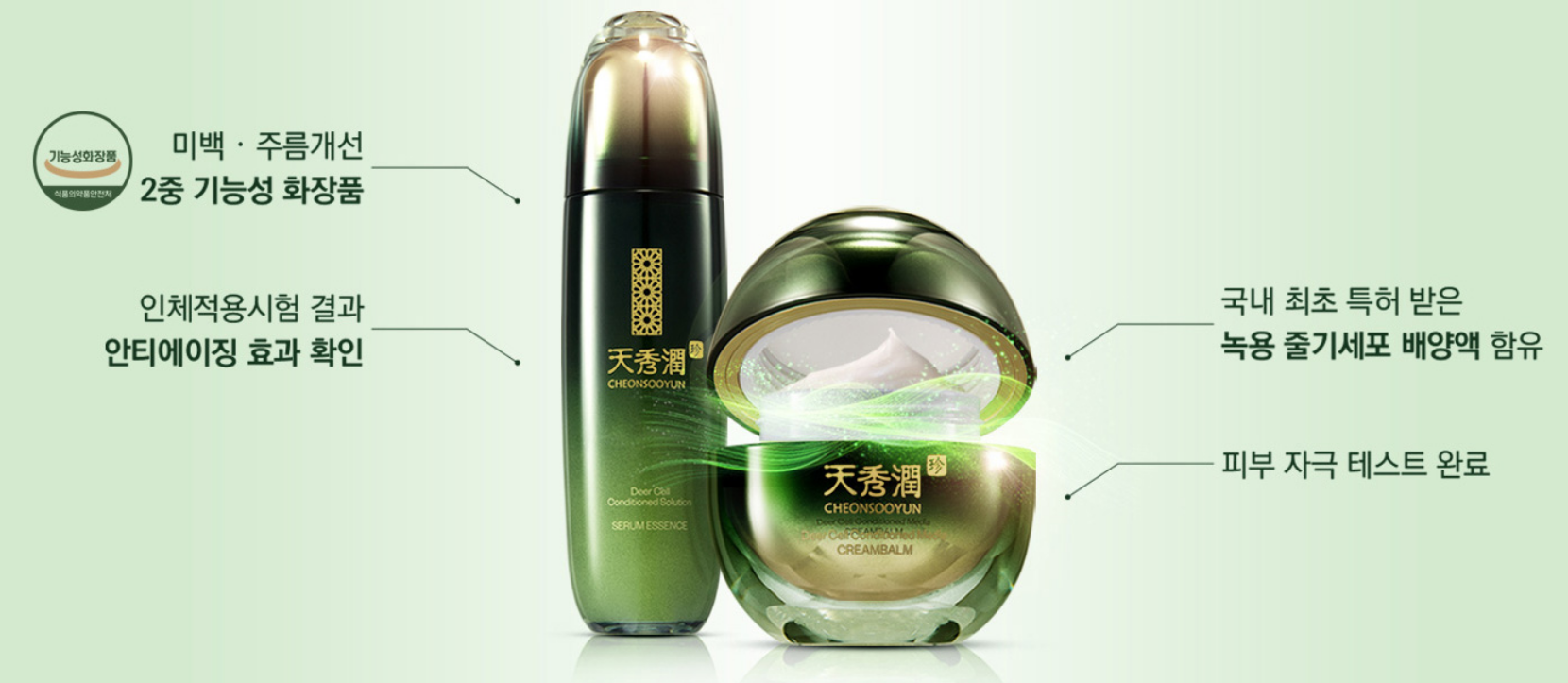 천수윤진은 미백 주름개선 2중 기능성 화장품으로, 인체적용시험 결과 안티에이징 효과가 확인되었는데요. 국내최초 특허받은 녹용 줄기세포 배양액이 함유되어 있으며, 피부 자극 테스트를 완료했습니다.